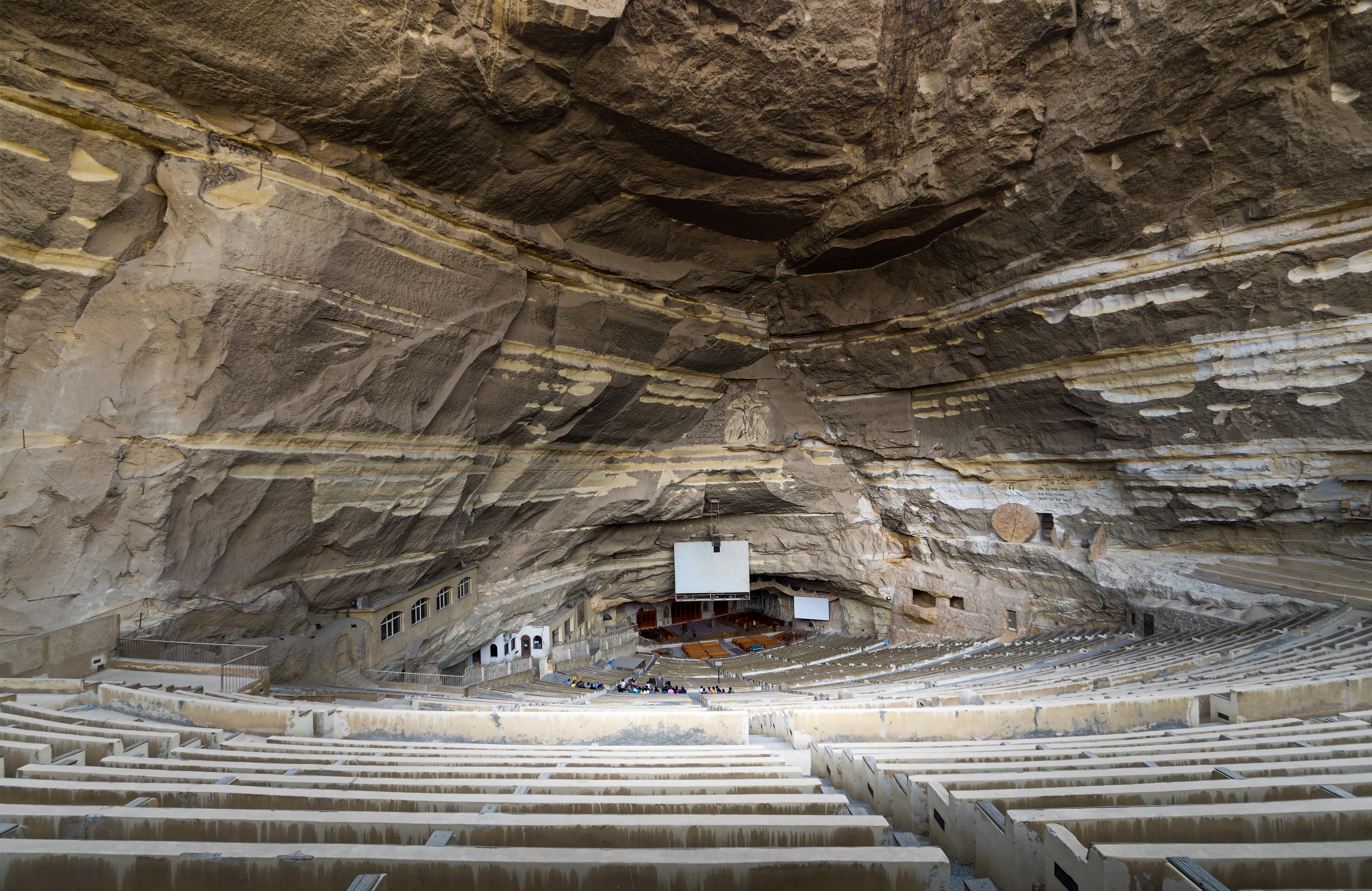 Then move to the Cave church the local Coptic Church in Mokattam Village which was established in 1975. After the establishment of the church , the Zabbaleen felt more secure in their location and only then began to use more permanent building materials , such as stone and bricks , for their homes . Given their previous experience of eviction from Giza in 1970 , the Zabbaleen had lived in temporary tin huts up till that point . In 1976 , a large fire broke out Manshiyet Nasir , which led to the beginning of the construction of the first church below the Mokkatam mountain on a site of 1.000 square meters . more churches have been built into caves found in Mokkatam . Currently , there are seven cave churches hidden among the caves of Mokattam Mountain . The monastery of St Simon the Tanner is the largest and it has an amphitheater with seating capacity 20.000 . this church is the largest church in the Middle East .